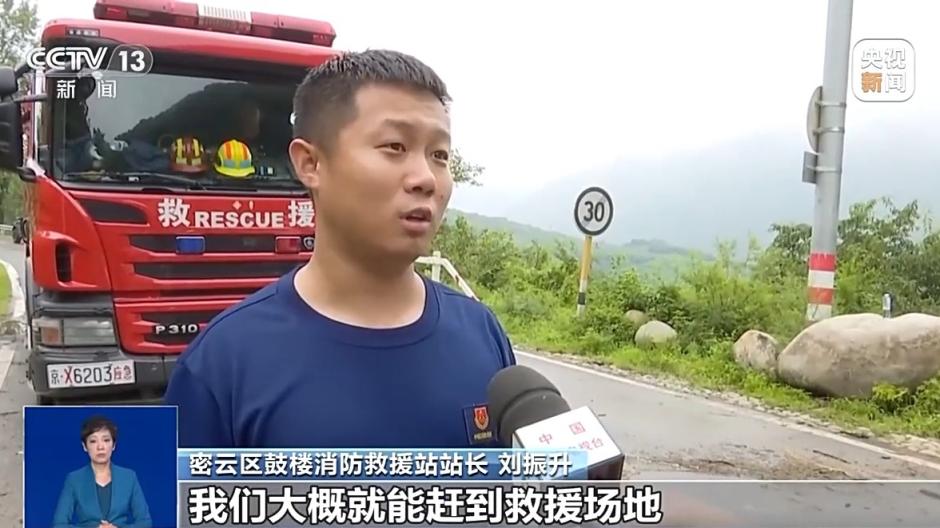 密云区鼓楼消防救援站站长 刘振升:其实我们的车大概能开到村口,当时地图导航显示1公里左右,我们感觉24分钟左右大概就能赶到救援场地。其实再往里走,整个道路已经被昨晚的雨水全部给冲塌了,大概冲塌的位置有二十几处,要么就是石头,要么都是一些树木,所以我们最后到达报警人给我们的位置,大概用了一个小时。